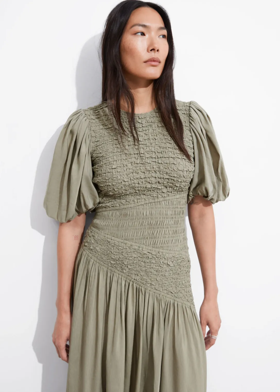 Robe midi avec des empiècements à smocks et une jupe légèrement plissée créant un ourlet asymétrique.