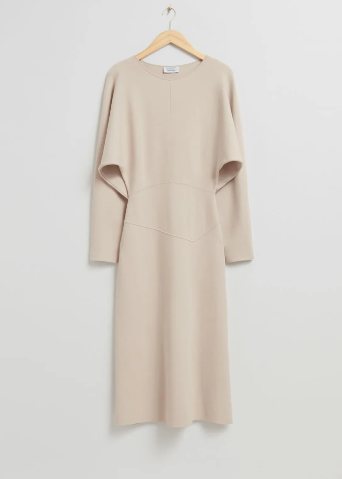 Robe midi en maille, avec des manches longues et une encolure arrondie. Dotée de coutures asymétriques apparentes à l’avant et à l’arrière.