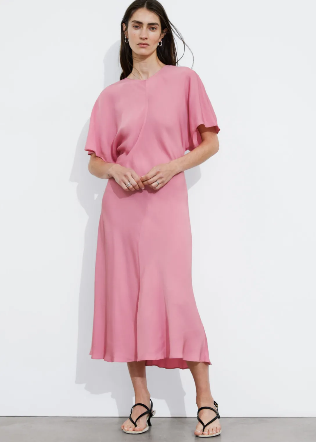 Robe midi en satin avec des manches volantées et des coutures courbées apparentes pour une finition légèrement drapée.