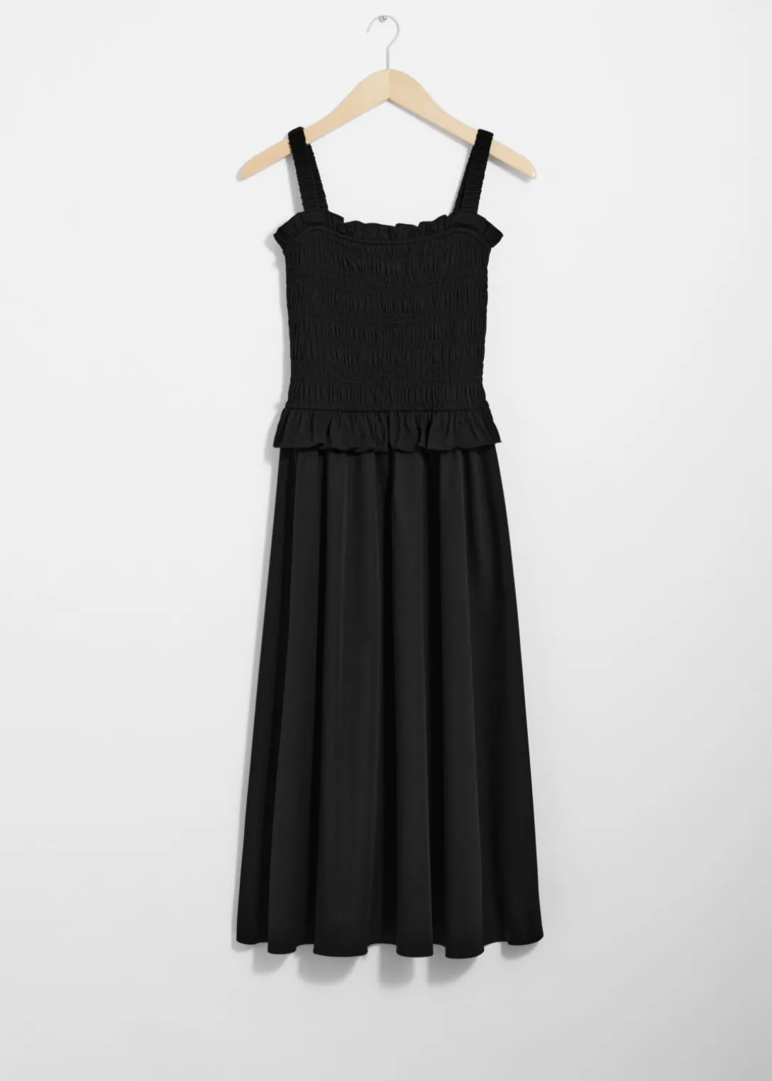 Robe midi trapèze sans manches avec un corsage froncé et des volants au niveau du cou et de la taille.