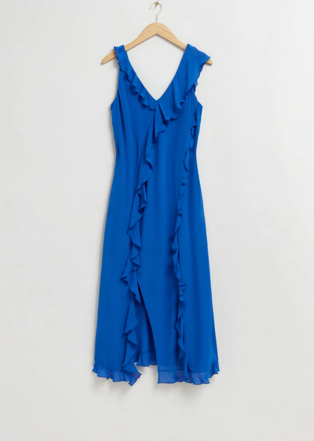 Robe midi sans manches en tissu soyeux doux. Dotée d’une encolure asymétrique et ornée de volants sur toute la longueur.