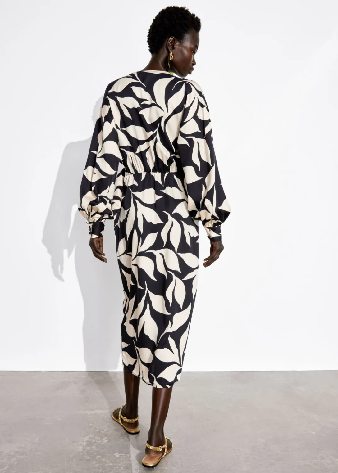 Robe portefeuille à col en V en tissu texturé, doux et soyeux. Dotée de longues manches style blouson amples, d’une taille ajustable, d’une coupe midi et d’une jupe drapée avec un ourlet forme tulipe arrondi.
