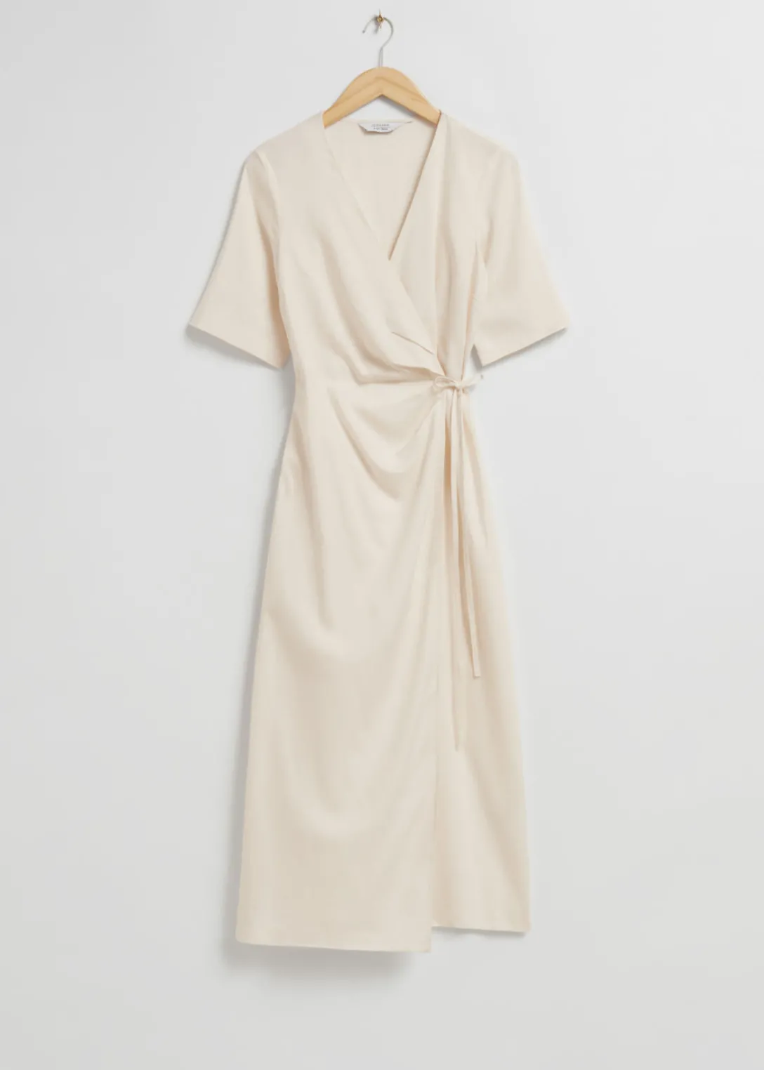 Robe portefeuille midi à manches courtes et col en V. Nouée sur le devant à la taille, mais aussi dotée de plis et d’une jupe en diagonale.