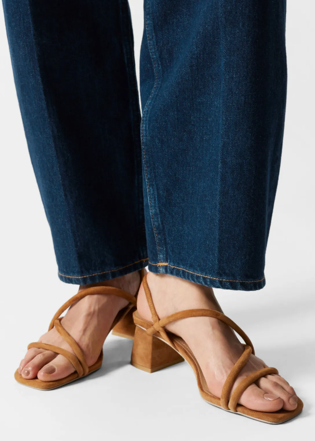 Sandales à talons épais confectionnées en cuir souple et dotées d’une silhouette minimaliste à brides, avec une sangle élastique à l’arrière pour un meilleur ajustement.