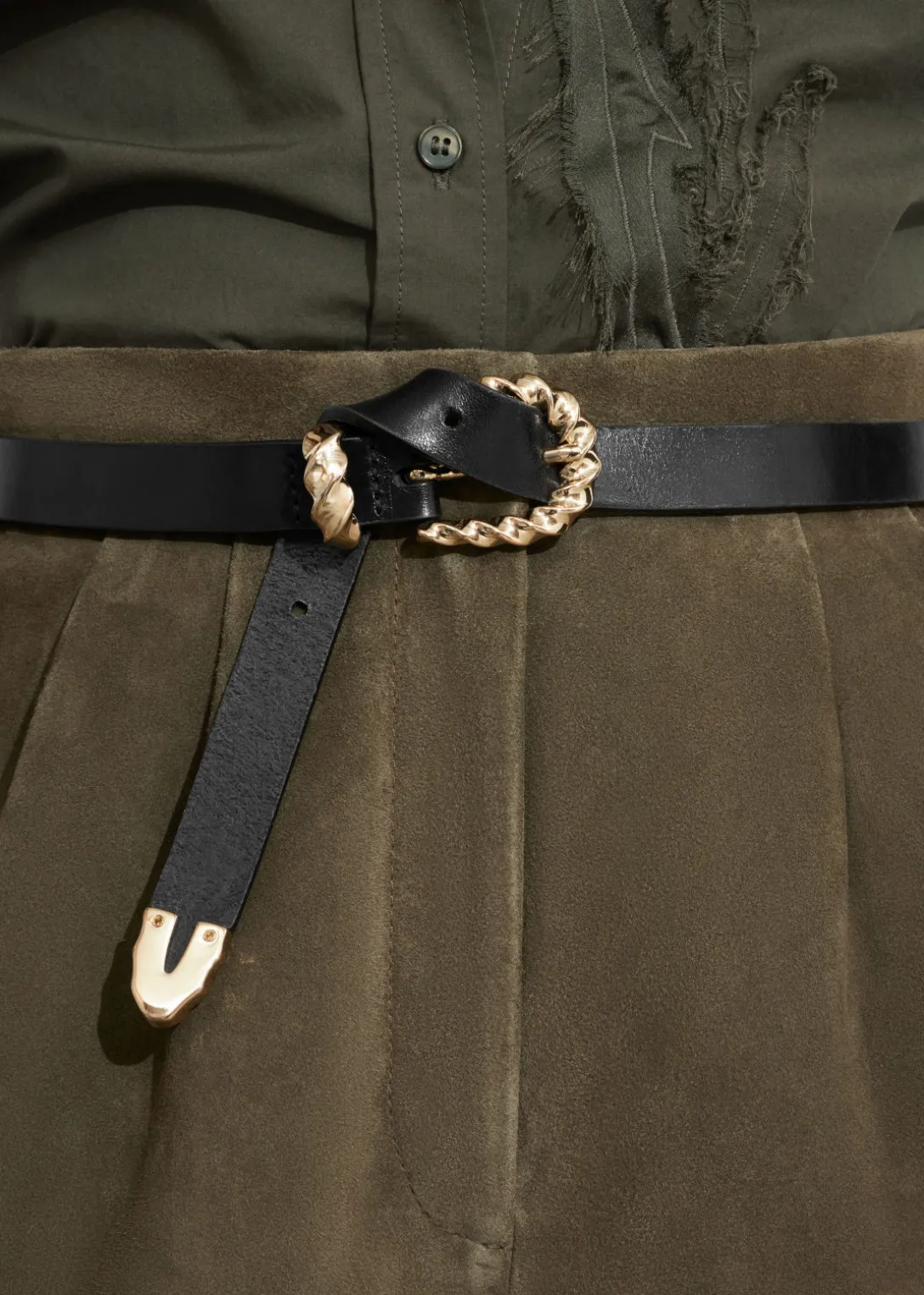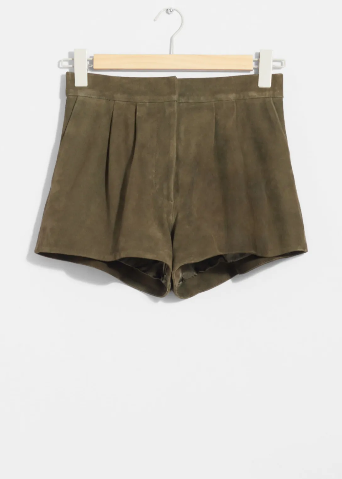 Short à taille haute en daim, avec deux poches et une braguette zippée avec fermeture à agrafe.