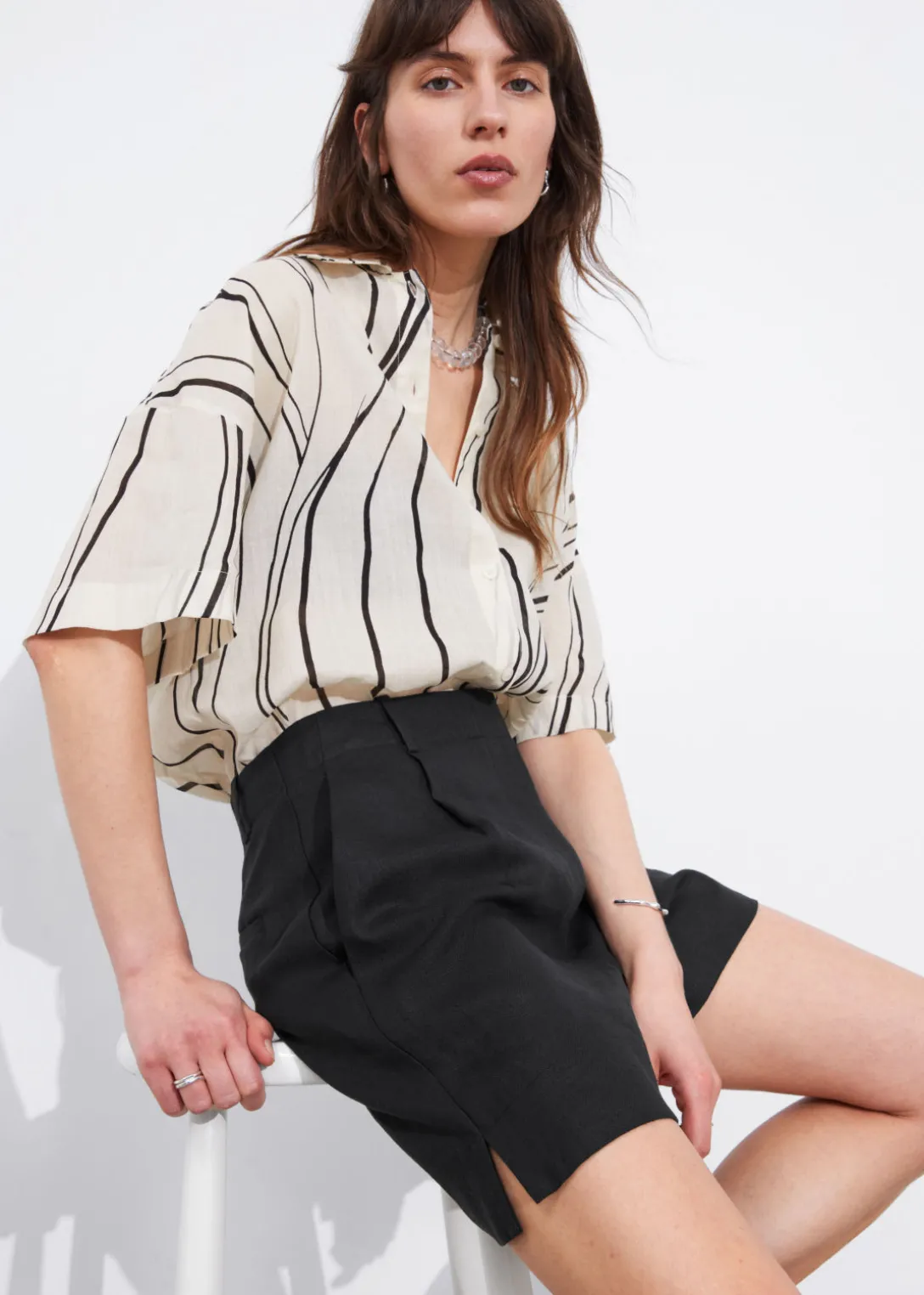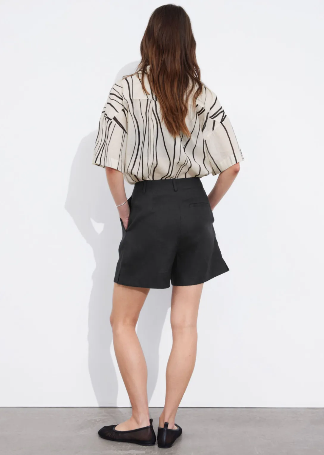 Short à taille haute en lin, avec des plis au centre à l’avant créant une finition habillée.