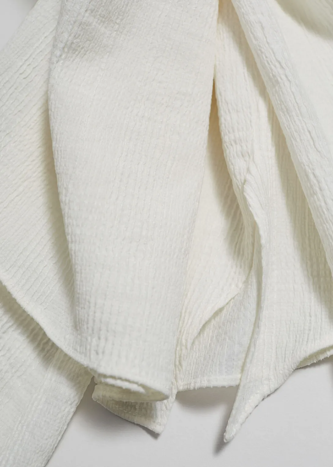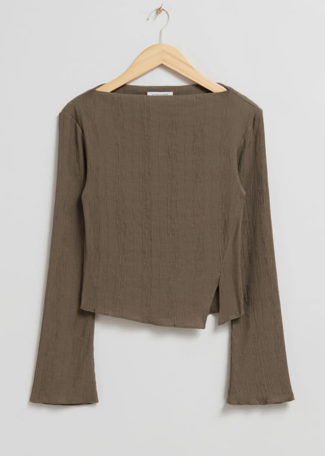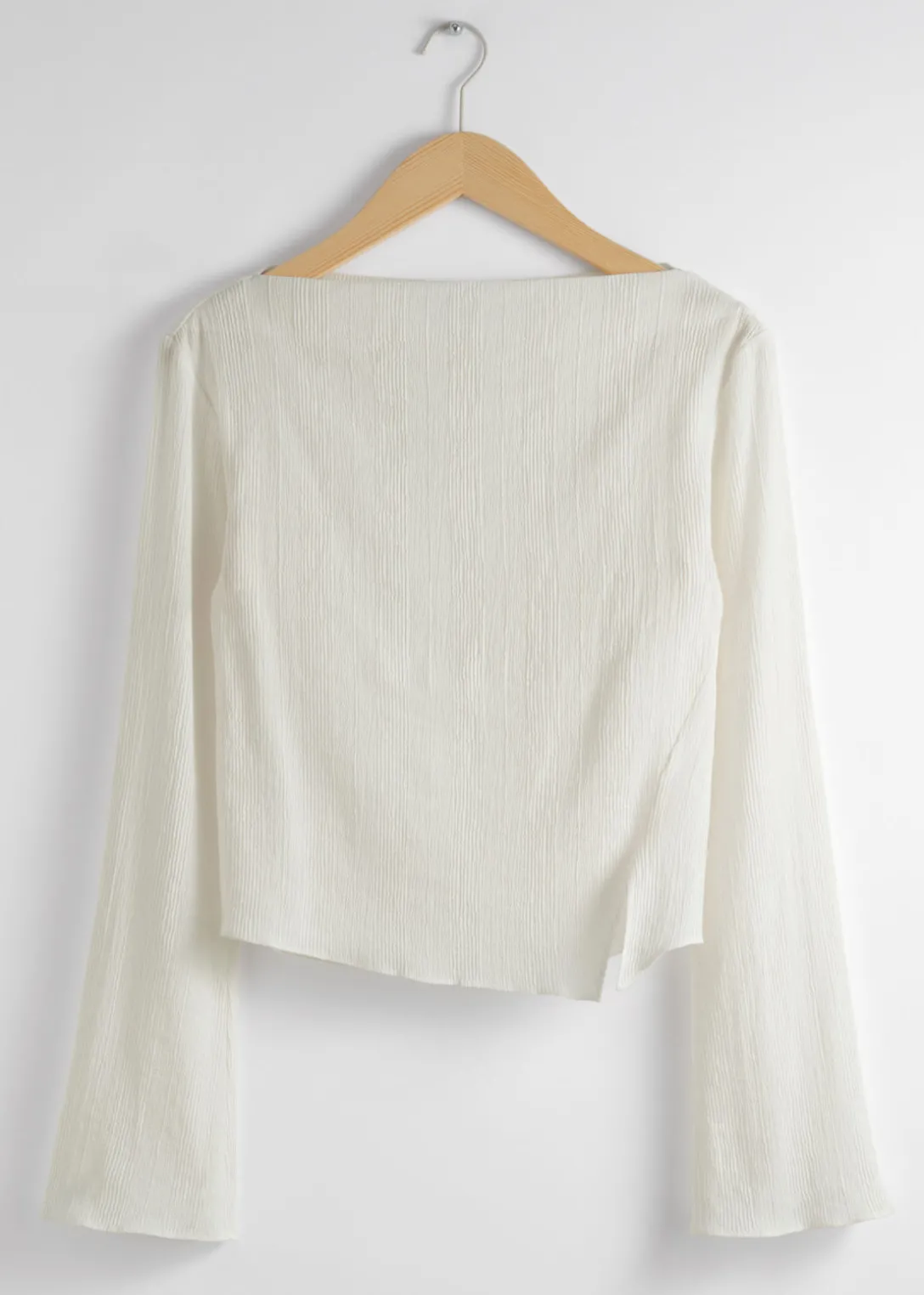 Haut ajusté à manches longues doté d’une coupe asymétrique courte, de bords volantés et d’une finition côtelée.