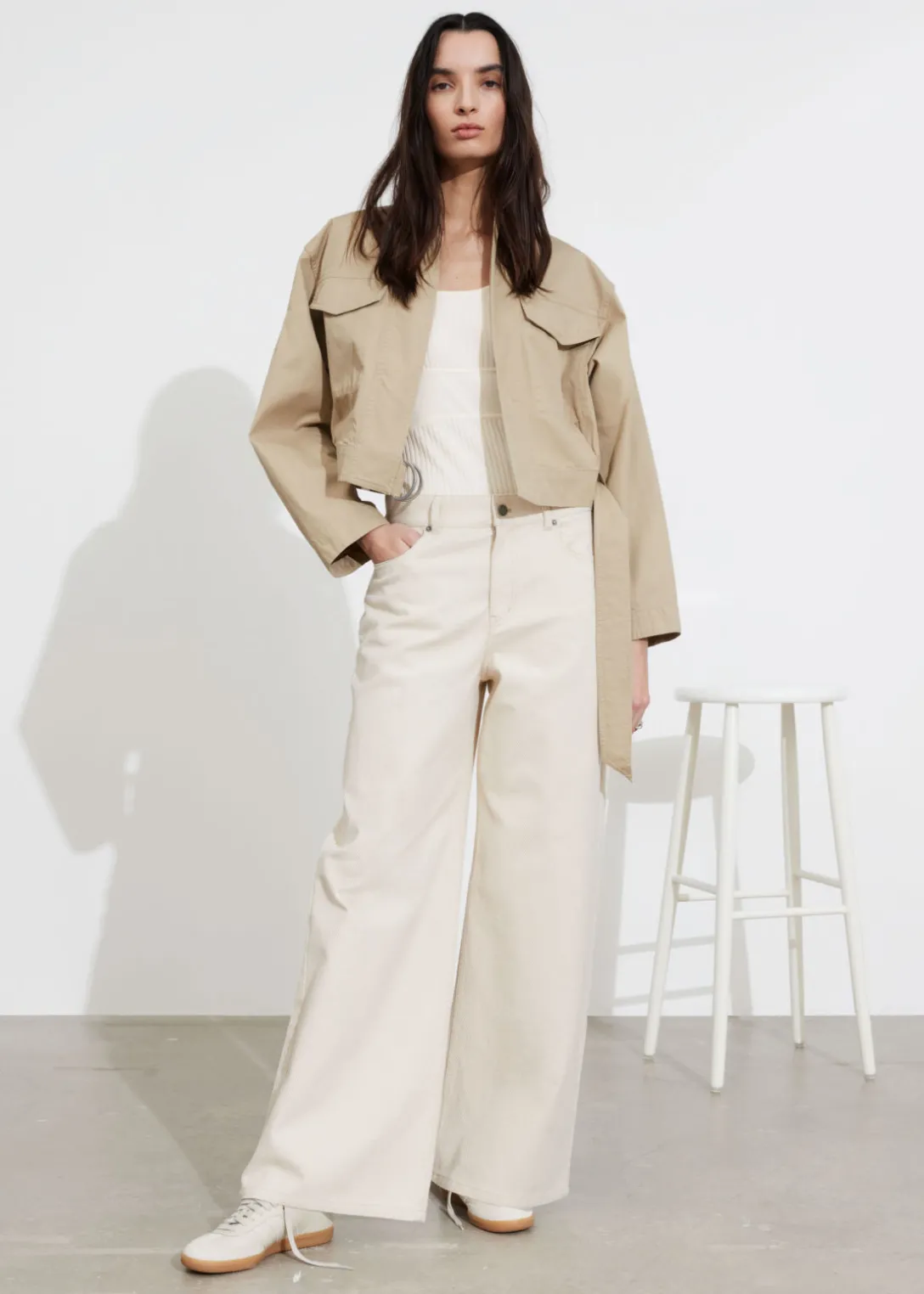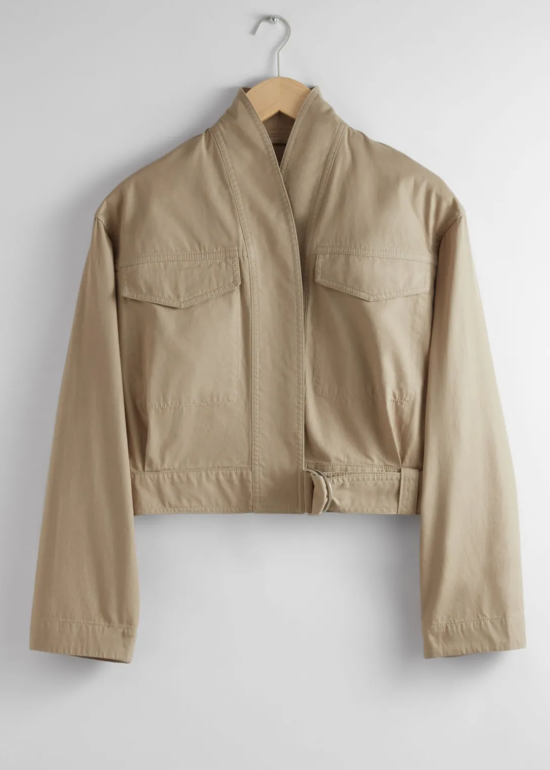 Veste courte à la finition épurée. Dotée d’un col châle et d’une patte ouverte pouvant être attachée grâce à une boucle en D à la taille.