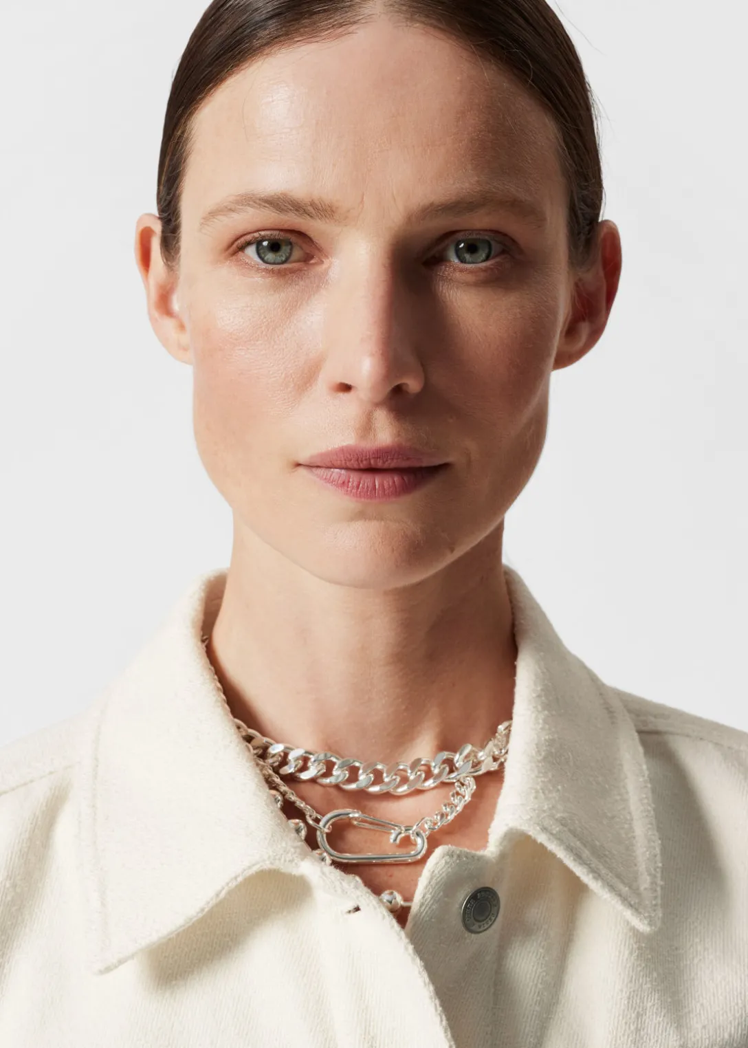 Veste courte ornée de cinq boutons style denim, avec deux poches plaquées et des surpiqûres.