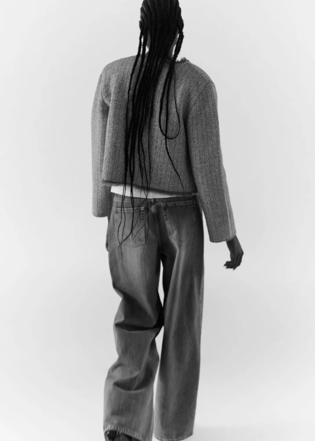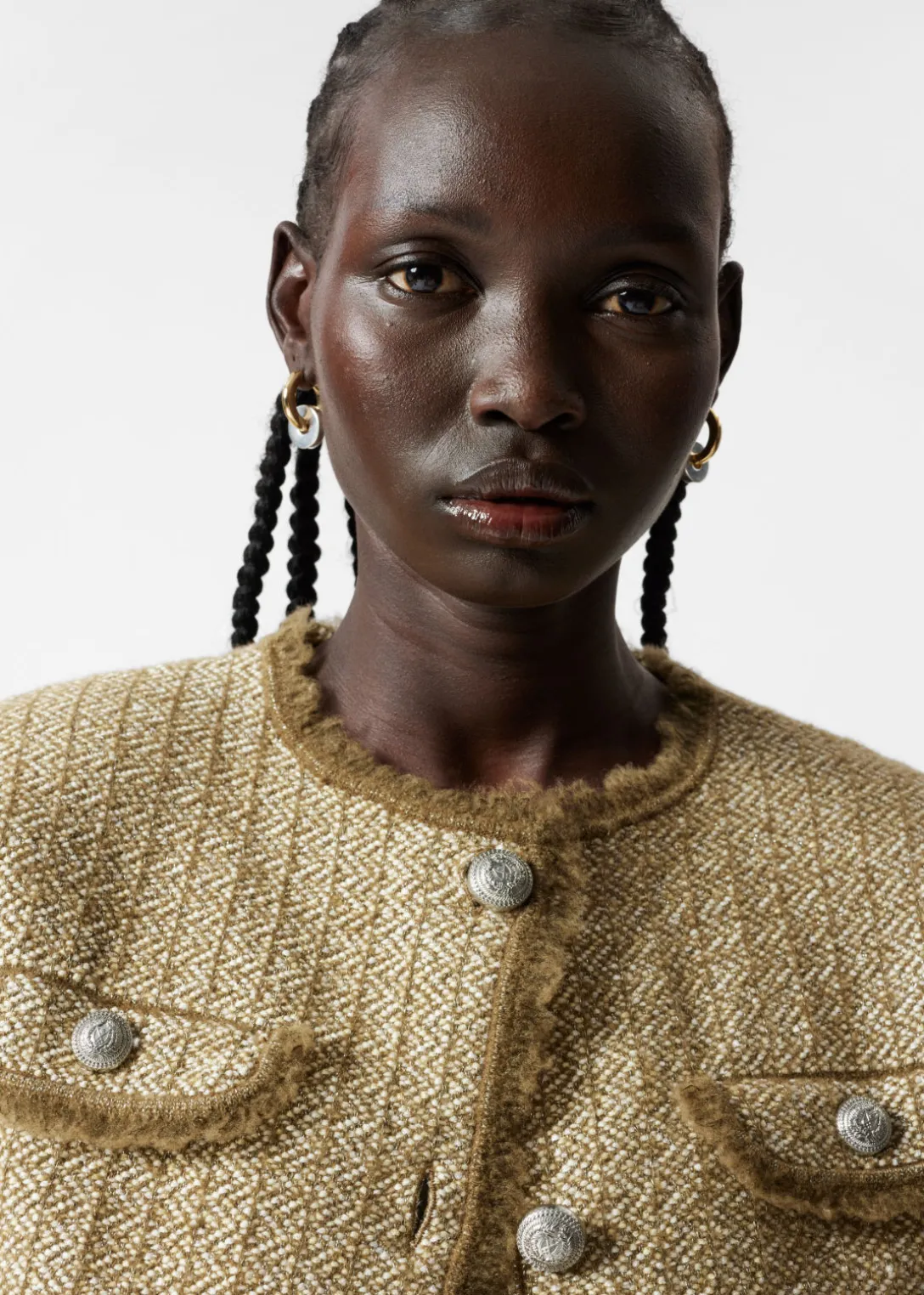 Veste courte en tweed avec une finition métallisée subtile. Dotée d’épaulettes, de touches contrastées et d’une fermeture boutonnée en métal.