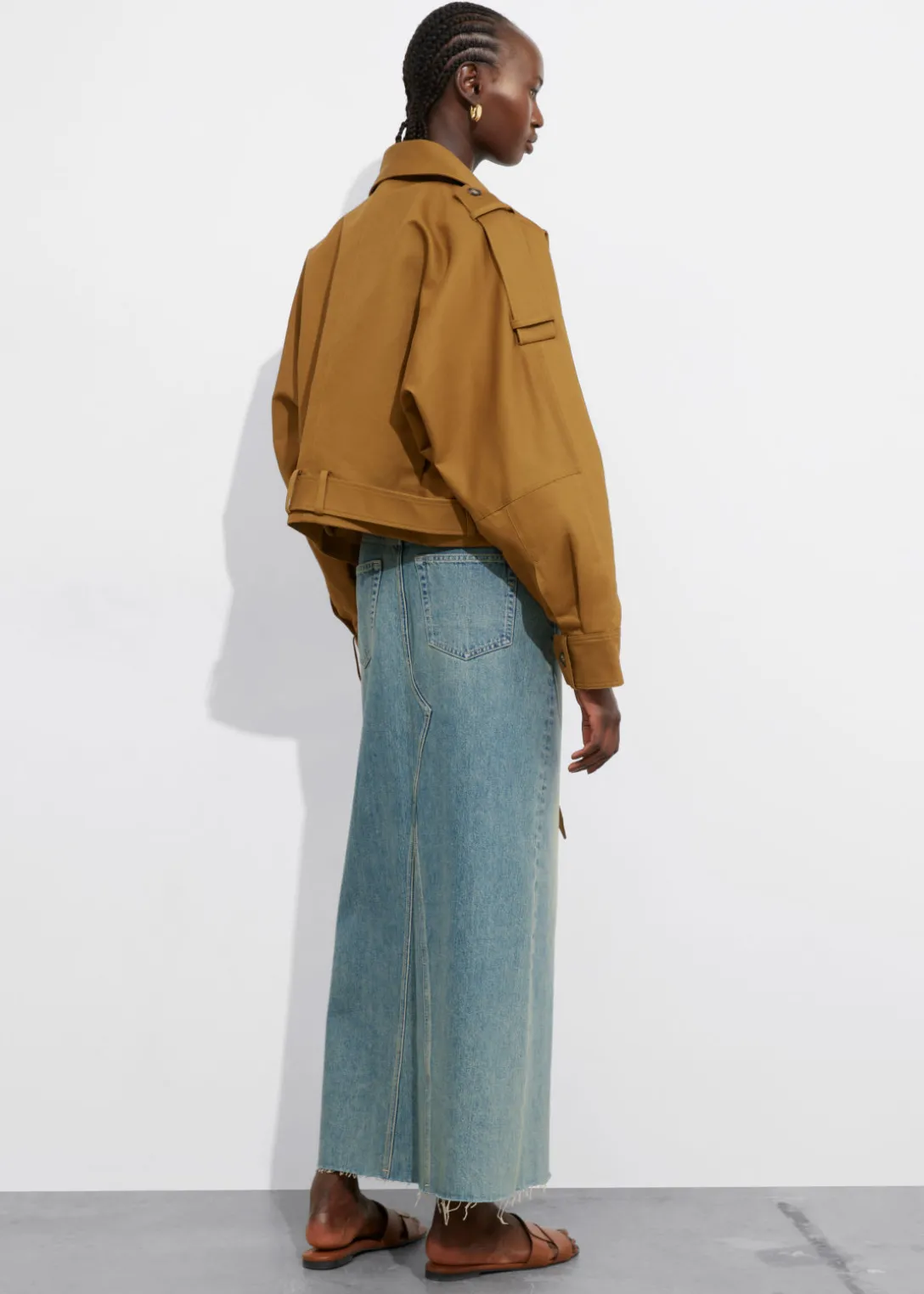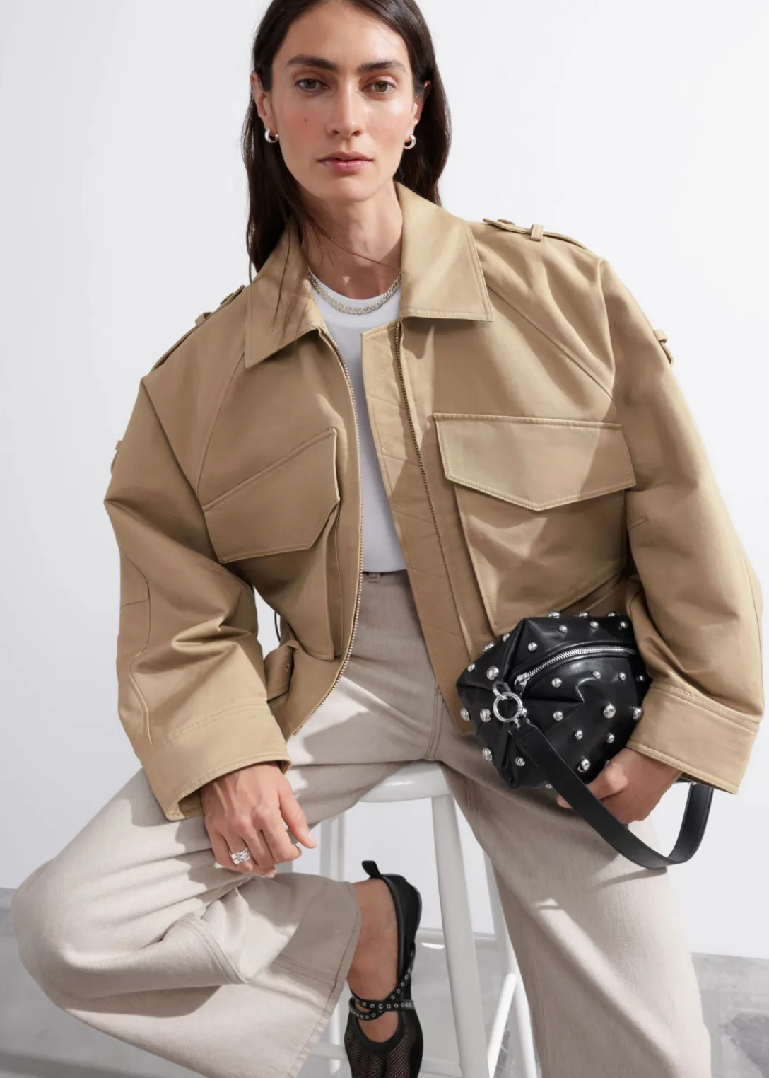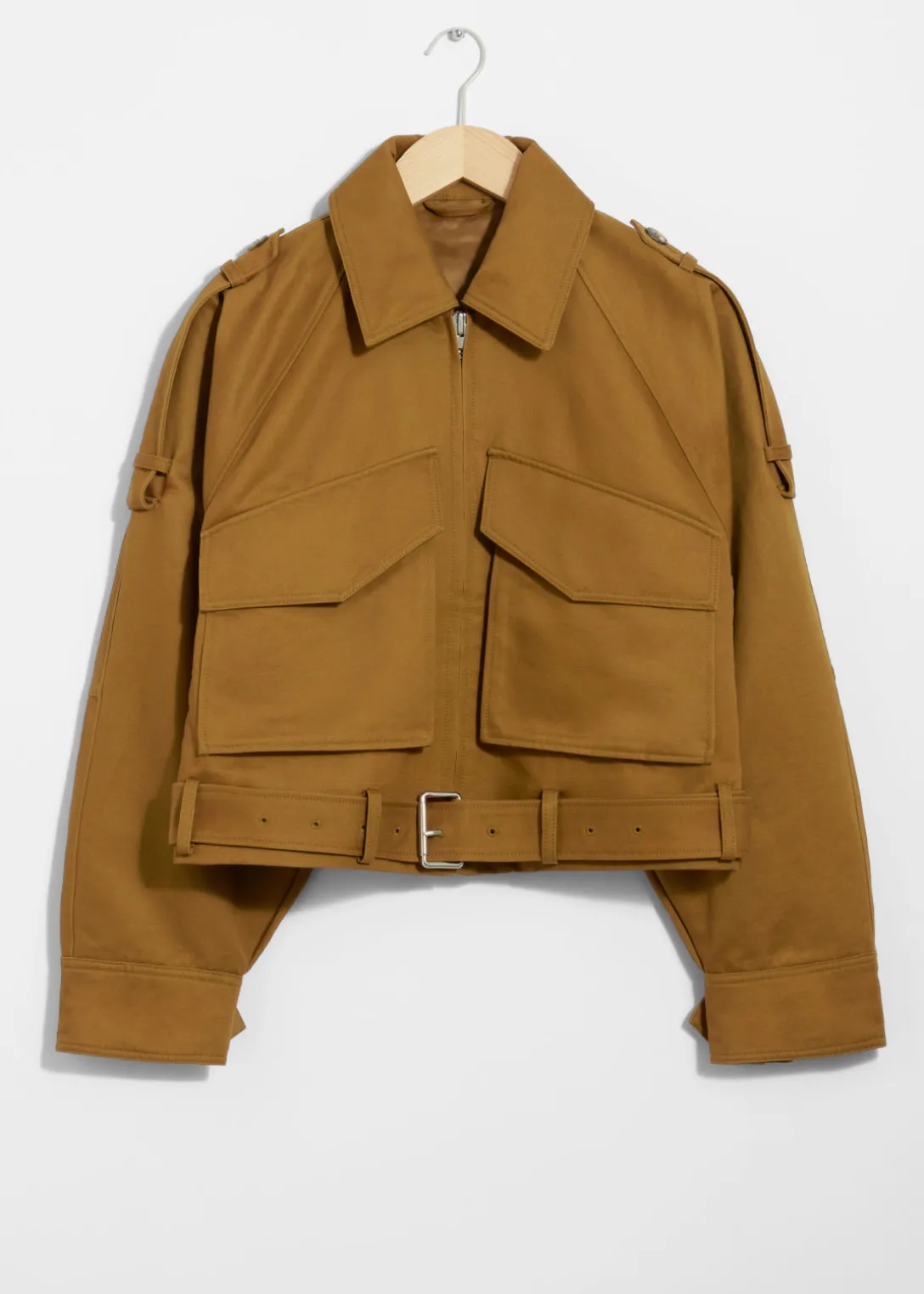 Veste courte zippée avec des épaulettes, deux poches plaquées et une ceinture à boucle à la taille.