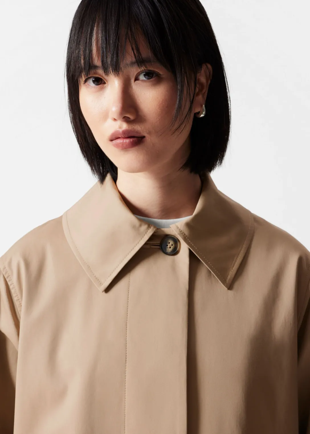 Veste trois-quarts à la finition épurée, avec une patte boutonnée dissimulée.